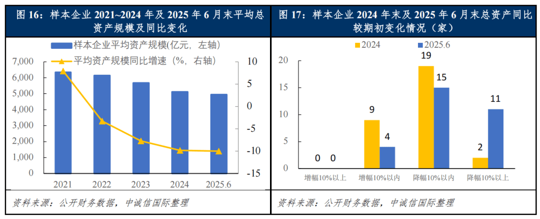 从总资产规模维度看,2024年以来,房地产行业“缩表”进程持续,平均总资产规模延续收窄态势,但收缩速度已出现分化与缓和迹象。从样本企业来看,2024年样本企业平均总资产规模的同比降幅较2023年有小幅扩大,2025年上半年整体仍保持该趋势。从变化范围与幅度看,2024年资产缩水现象最为普遍,近九成样本房企总资产规模下降,其中有11家企业降幅超过10%;进入2025年上半年,资产规模下降的房企比例已收窄至七成,且绝大多数企业的资产降幅已控制在10%以内。从资产构成看,2024年在销售承压及市场预期谨慎的背景下,多数样本房企削减控制土地投资支出,并随着销售交付的持续转化,存货规模平均降幅明显,为资产收缩的主要原因,2025年以来部分规模房企在核心城市审慎加大土地获取力度,同时,半年报多数样本企业未大幅计提存货减值损失,存货规模降幅显著收窄;同时,随着到期债务的偿还及拿地,货币资金的下降趋势仍在持续,且2025年以来平均降幅小幅扩大。我们认为,主要资产科目经过深度挤压后,继续大幅收缩的空间有限,行业重心从此前的规模收缩,转向存量资产的质量优化,行业总资产规模将在底部趋于稳定。
