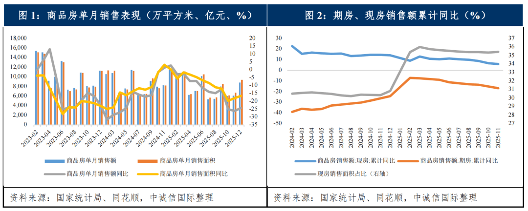 总体来看,2025年房地产销售规模降幅收窄,需求结构向改善型进一步转变,各能级城市房价指数降幅普遍收窄,库存去化取得积极进展,央国企仍是市场最重要参与主体,但政策支持力度相较上年有所减弱,2025年二季度以来商品房销售额累计降幅扩大,2026年商品房销售额仍面临较大下行压力。