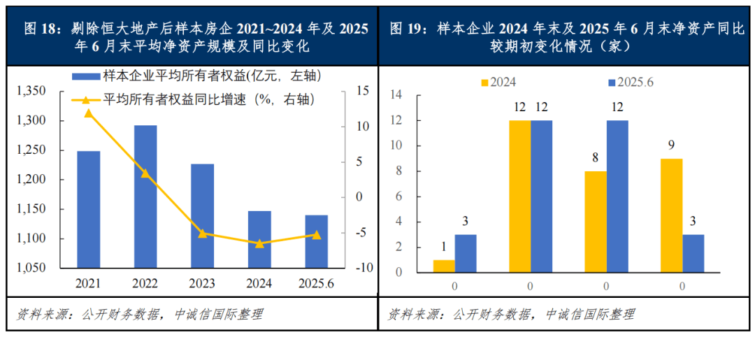从净资产角度看,2024年以来,受行业整体盈利困境拖累,未分配利润减少,样本房企平均净资产整体延续下降趋势,由于个别样本企业(如“恒大地产”)净资产为负,对整体算术平均值影响较大,为更准确反映行业普遍趋势,在剔除该异常值后,样本平均净资产在2024年末降至阶段性低点后,已于2025年6月末实现环比回升。从具体样本来看,大部分样本企业变动幅度在±10%以内区间,内部分化趋势较为明显,2024年,约六成样本房企净资产出现缩水,进入2025年上半年,净资产增加与减少的样本房企各占一半。行业性亏损导致未分配利润持续减少,是拉低净资产平均水平的原因之一;此外,少数股东权益的趋势变动有所分化,具体而言,多数民营企业受资金压力及风险偏好下降影响,正减少合作并加速项目出清,少数股东权益收缩;而部分资金稳健的国央企,则在热点城市加强“抱团”拿地,从而带动其少数股东权益增长。展望2026年,低毛利项目结转及减值影响将持续侵蚀利润,然而,土地市场的合作模式预计将延续,拥有优质产品打造能力及深耕高能级城市的房企将在合作开发及净资产表现上取得优势。