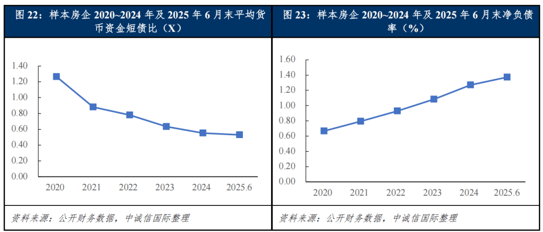 货币资金短债比、净负债率分别从短期流动性和杠杆水平方面,衡量房企短期及中长期的偿债压力,近年来样本房企在这两项指标上均呈现持续弱化的趋势。具体来看,样本房企的货币资金短债比已连续下滑,剔除个别异常值(如“恒大地产”)影响,大部分样本企业自2023年起货币资金已无法覆盖短期债务,且这一缺口在2024年及2025年上半年继续扩大。净负债率方面,受行业持续亏损、销售回款放缓等原因影响,样本房企的净负债率水平持续攀升并处于历史高位。预计2026年尽管房企普遍保持审慎的投资策略,债务规模大幅扩张的可能性较低,但市场销售仍处于筑底阶段,销售回款难有大幅跃升,在净资产可能因盈利困难而继续承压的背景下,净负债率仍面临一定的上升压力。