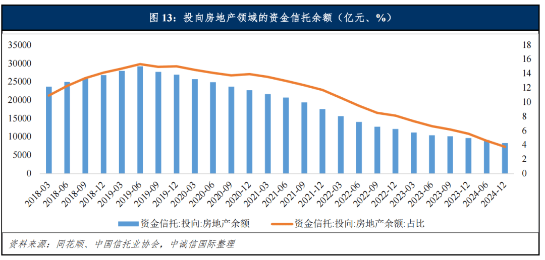信托融资方面,近年来,受行业下行及强监管影响,房地产信托资金持续萎缩。截至2025年6月末,房地产信托余额0.77万亿元,同比收缩约0.15万亿元。虽然各项政策放开房地产融资渠道,政策端支持对信托融资进行展期,但是考虑到房地产整体行业规模收缩叠加项目盈利空间收窄,土地投资及项目开发趋于谨慎,可匹配信托资金的房地产项目规模亦不断萎缩,预计投向房地产领域的信托资金余额仍将进一步下降。