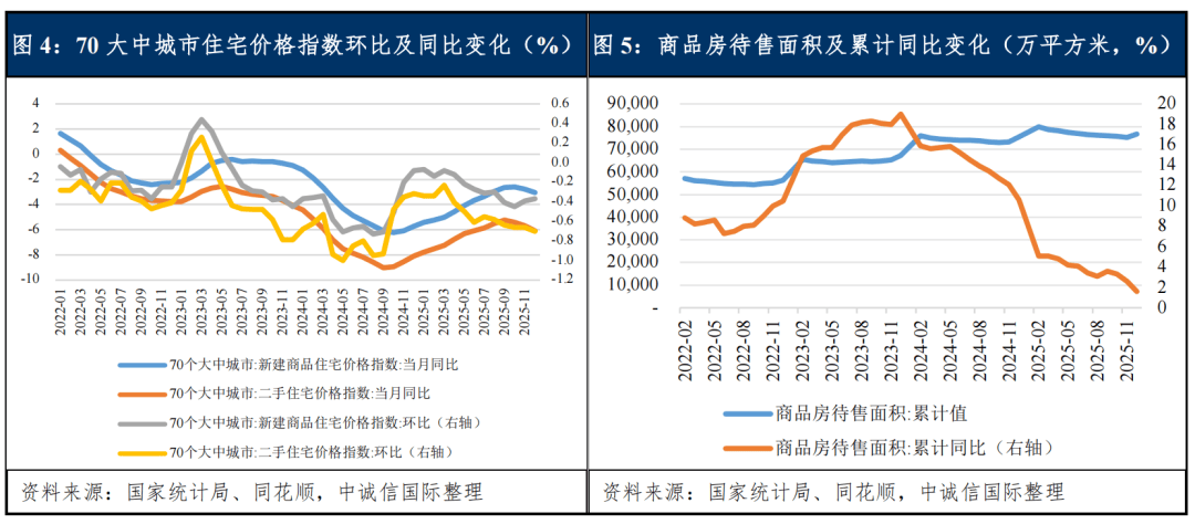 库存方面,截至2025年末,商品房待售面积为76,632万平方米,同比增长1.6%,增速较上年末收窄9个百分点、幅度显著,房地产市场去库存已取得一定进展,2026年待售面积有望出现拐点性下降,但在商品房销售额尚未完全企稳的背景下,去化压力仍存。