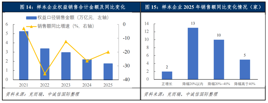 从权益销售金额维度看,自2024年“9.26政治局会议”以来的政策定调,及后续一系列“促需求、稳预期”政策的密集出台与落地,2025年,尽管行业销售规模整体仍在下降,但降幅已有所收窄,当前房地产行业处于明确的“止跌回稳”关键周期。具体来看,仅2家房企实现销售额正增长,较上年数量进一步减少;绝大部分央国企的销售降幅能够控制在20%以内;销售降幅在20%~40%及40%以上的区间,则主要由民营企业和部分混合所有制企业占据。考虑到居民收入预期依然偏弱,短期销售规模仍面临压力,预计2026年房地产销售规模仍将处于调整与筑底阶段,但销售规模的下降幅度有望进一步缩窄。