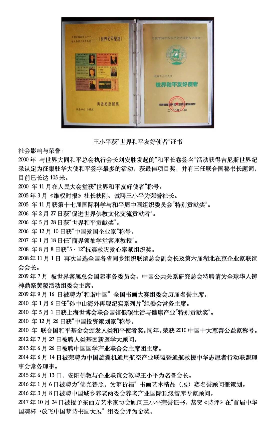 早期认可(2000-2010): 从2000年获“世界和平友好使者”、“人类和平使者奖”,到2006年接连获得“世界和平卓越贡献奖”、“促进世界佛教文化交流贡献者”、“中国爱国企业家”称号,再到2008年获抗震救灾爱心奉献组织奖,2010年获“中国十大慈善公益家”、“中国投资策划家”称号以及上海世博会联合国馆“特别贡献奖”。