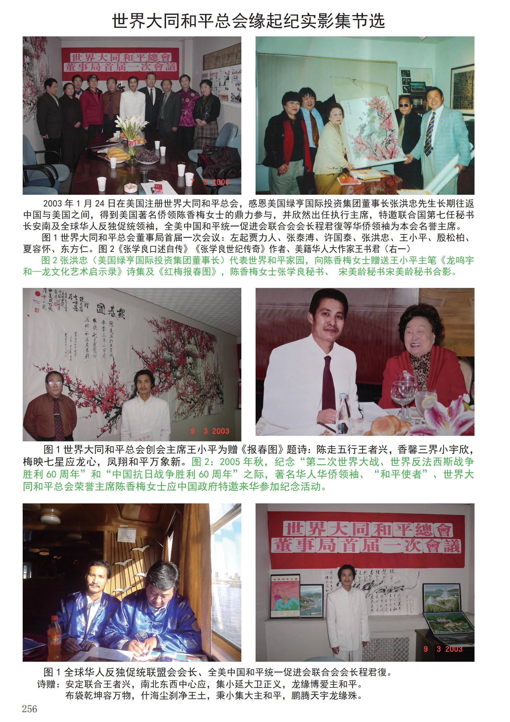 第二章:体系构建与和平实践(2003-2012)为使和平事业制度化、国际化,王小平于2003年元月在美国策划创办了“世界大同和平总会”,世界著名华人华侨领袖、社会活动家、美国国际合作委员会主席陈香梅、全美中国和平统一联合会会长程君復、欧洲侨领单声等为联合创始人,并得到了前联合国秘书长安南、前美国总统老布什等国际友人的题词合影大力支持,同年5月16日,他在北京创立了爱和美国际文化交流有限公司,以此为平台,策划组织了十五场“龙缘沙龙”东西方文化艺流活动。在全国侨联庄炎林主席等领导的关怀下,在东方仁秘书长组织下,在许国泰、应明阳、巨锋,卞洪登、韩颐和、高嗣及共和国四大演学家曲啸、彭清一、李燕杰、刘吉部长等首都各界领导及各界名人的支持下,15个龙缘沙龙定期主办一年一度的二月二龙头缅怀先烈,三月三祭典三皇五帝古圣先贤。也是在这一年的12月26日,他发起并组织了“纪念毛主席诞辰110周年”活动,此后薪火相传,至今已连续举办二十一届,成为其系列文化活动中的重要品牌。