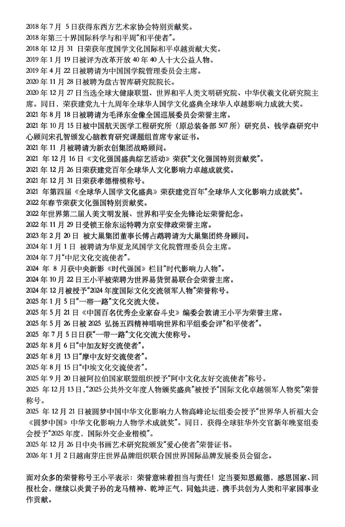 面对纷至沓来的荣誉,王小平始终保持着清醒的认知与谦卑的态度。他多次表示:“荣誉意味着担当与责任!定当要知恩戴德,感恩国家、回报社会,继续以炎黄子孙的龙马精神、乾坤正气,同勉共进,携手共创为人类和平家园事业作贡献。”